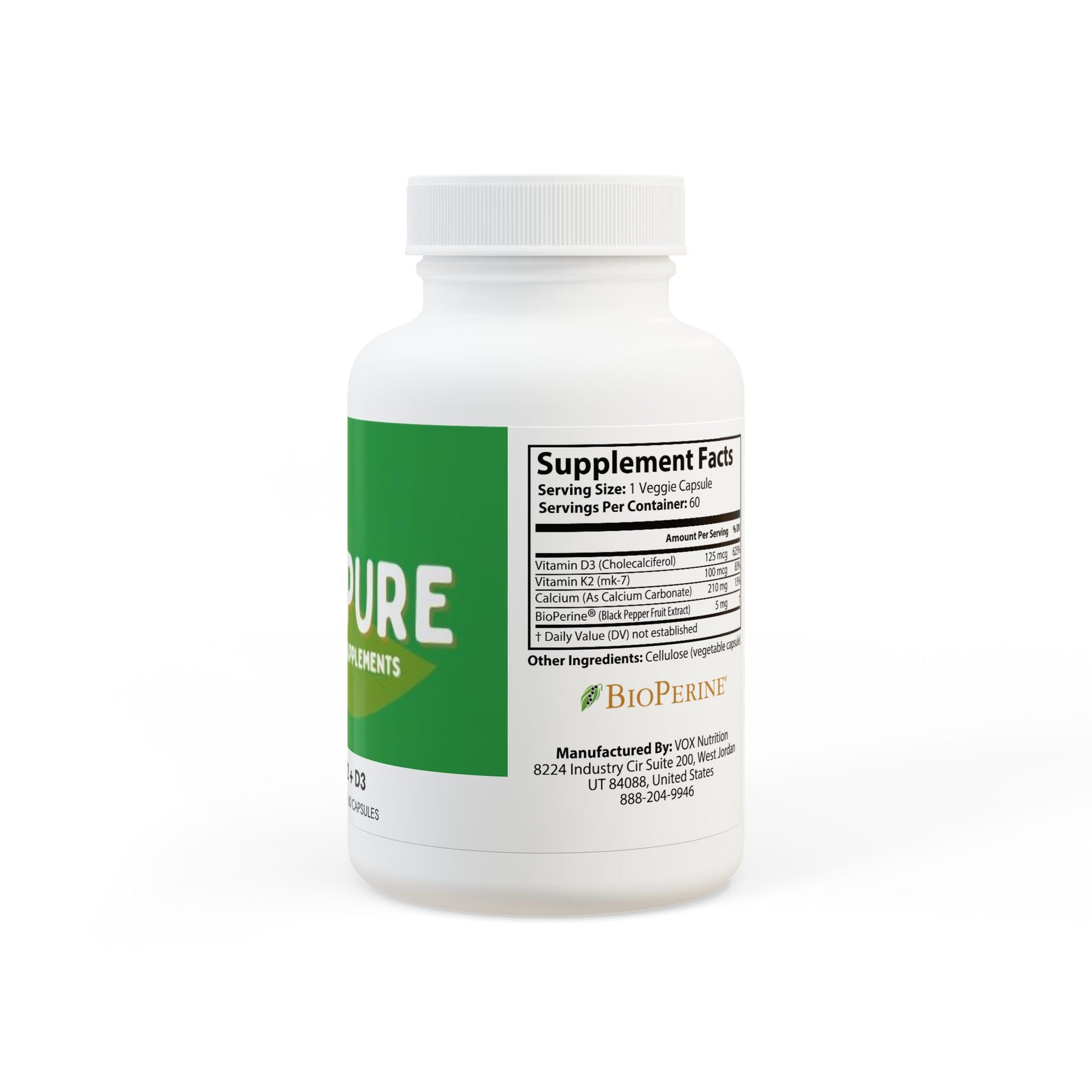 Ingredients: Vitamin D3 (Cholecalciferol), Vitamin K2 (mk-7), Calcium (As Calcium Carbonate), BioPerine ®(Black Pepper Fruit Extract). Other Ingredients: Cellulose (vegetable capsule).